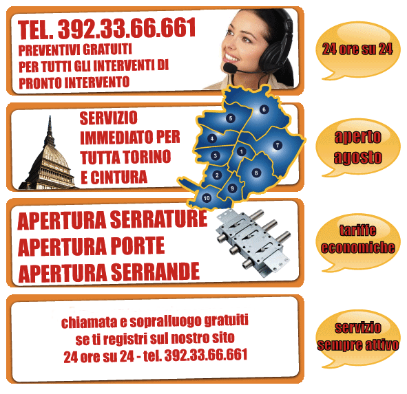 Inoltre riparazione e installazioni e vendita porte blindate, grate di sicurezza, lavori di fabbro. Pronto intervento su tutta Torino e provincia.